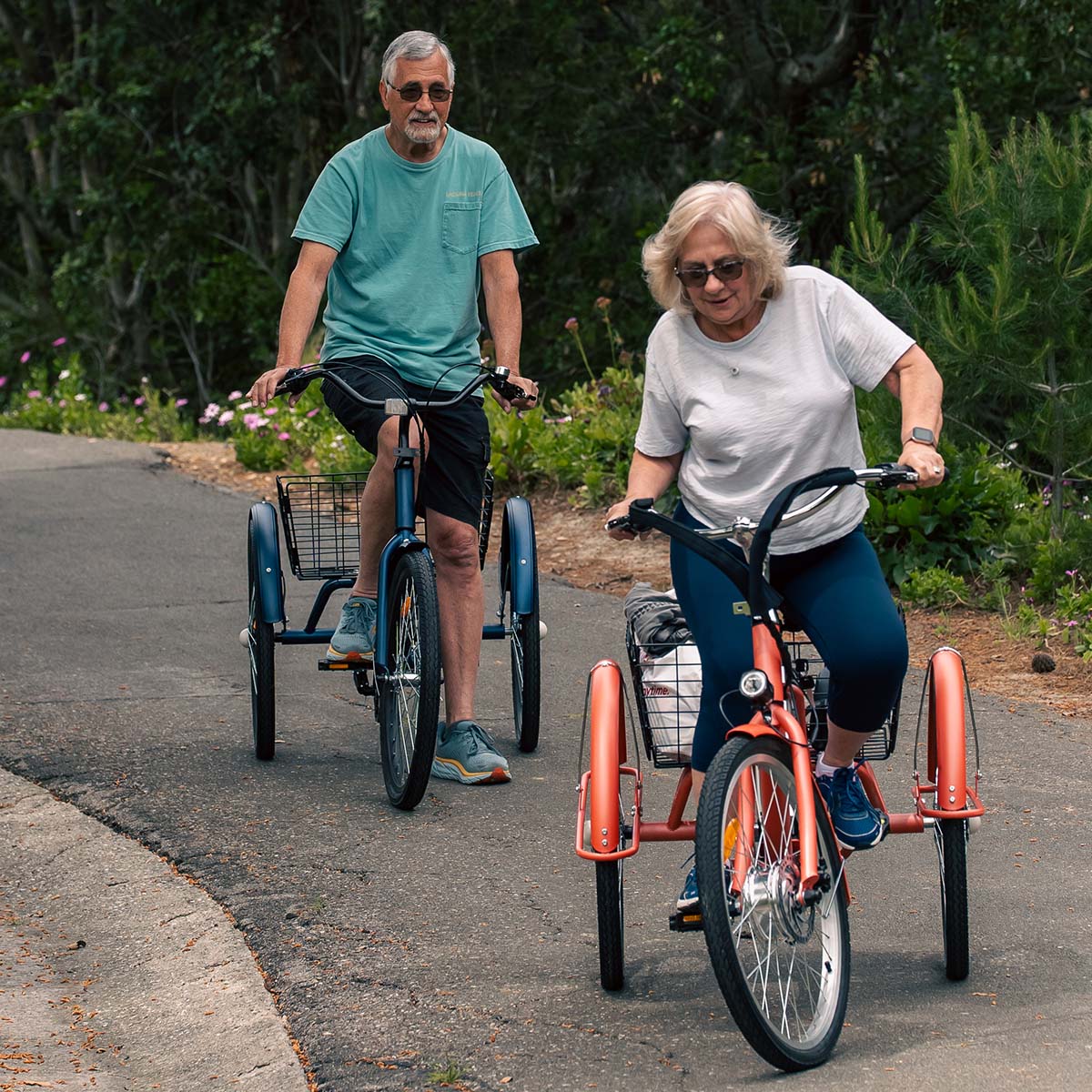 Tricycles provide increased stability and balance over two-wheeled bikes, making them ideal for seniors or those with mobility limitations. The three-wheel design also means you can stop and sit upright on the trike without tipping over.