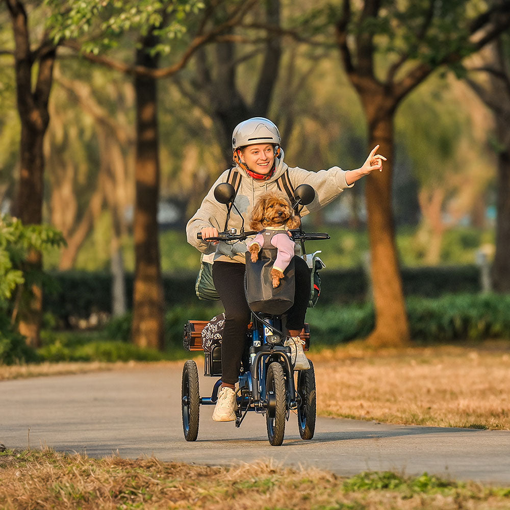 The dual-seat design combines versatility and functionality, with a rear seat that holds up to 55 lb., offering a practical solution for the electric trike to carry children, extra luggage, or small daily necessities